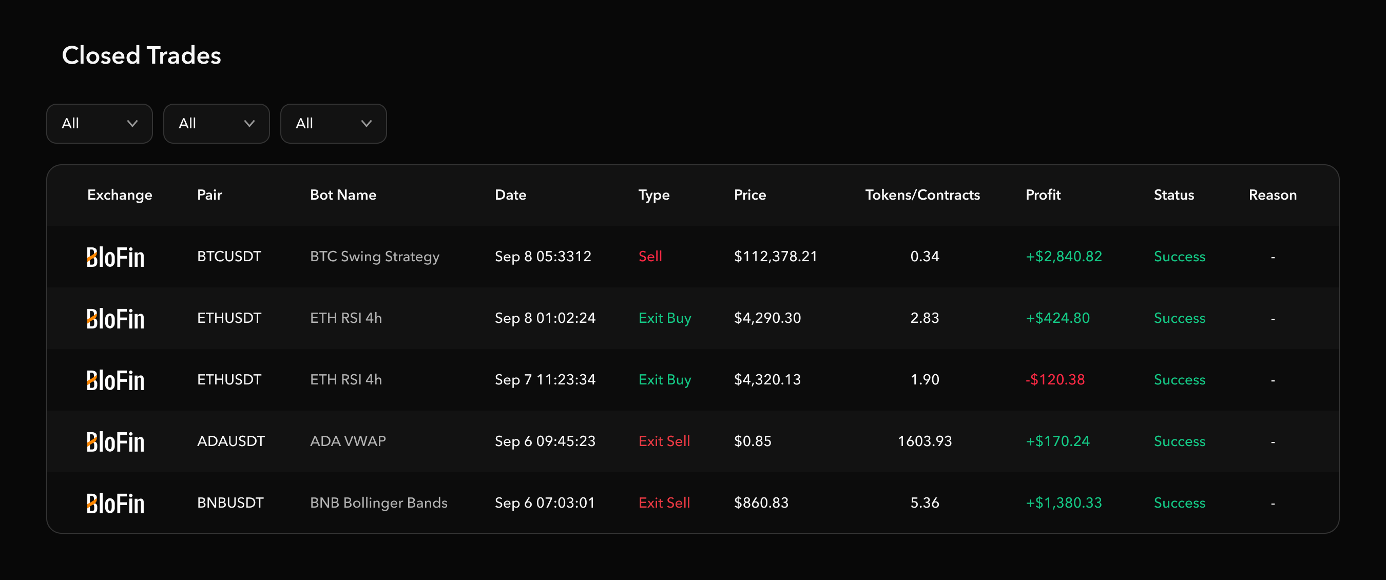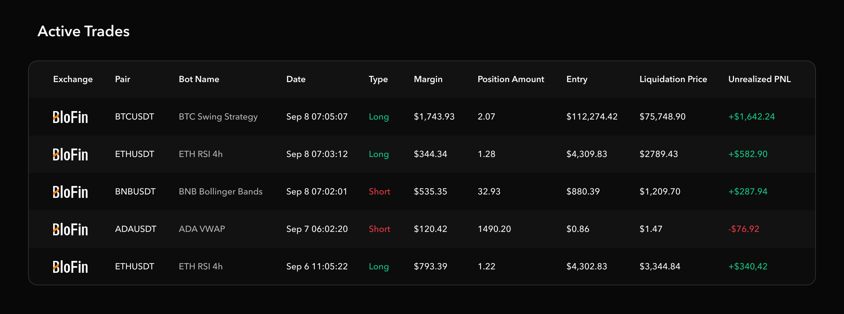 | BloFin   | ETH/USDT | ETH RSI 4h         | LONG  | $344.34   | $4,309.83    | `+$582.90`   |