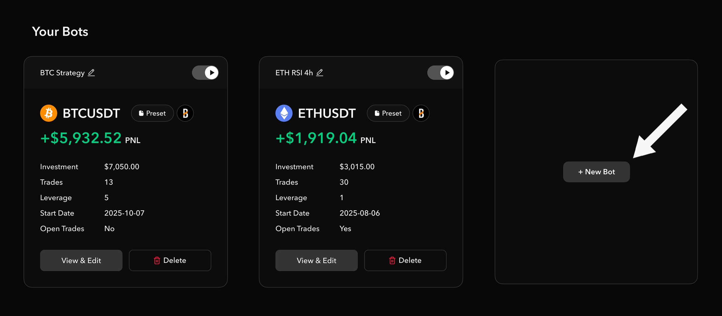 You can add new preset bots by clicking the + New Bot tile under the bot manager section. This will launch the Algo Bot page where you can select a preset algorithm to follow. This allows you to quickly add a new trading bot to your arsenal so you can adapt to new market trends as quickly as possible.