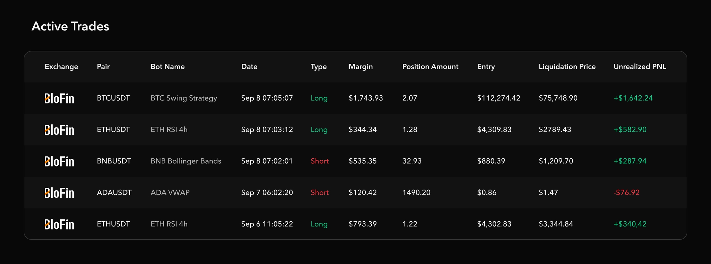 Each trading bot is displayed in its own summary card, showing all key metrics at a glance.
